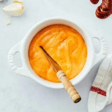 Etwa in den 1990er Jahren wurde in den USA der Begriff „Aioli“ verwendet, um jede aromatisierte Mayonnaise zu bezeichnen (vielleicht um es schicker zu klingen, wer weiß!). Der Unterschied? Mayo wird mit Rapsöl und ohne Knoblauch hergestellt. Viele aromatisierte Aiolis, die Sie im Laden oder in Restaurants finden, werden aus Mayonnaise hergestellt: Dies ist bei dieser Sriracha-Mayonnaise der Fall.