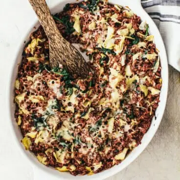 Um den roten Reis zu verwenden, haben wir diesen Reisauflauf kreiert. Es kombiniert die klebrige, beruhigende Essenz von Spinat-Artischocken-Dip mit den nährenden, ganzen Körnern von rotem Reis. Obwohl Sie diesen Reisauflauf sicherlich auch durch andere Reissorten ersetzen können, lieben wir den Kontrast des leuchtend roten Reises zum grünen Spinat. Es hat auch einen einzigartigen, nussigen Geschmack. Servieren Sie es zusammen mit einem Salat und unserem Rezept für cremige Polenta als Hauptgericht oder sogar zum Dippen mit Pita-Chips. Es ist gemütlich und nahrhaft.