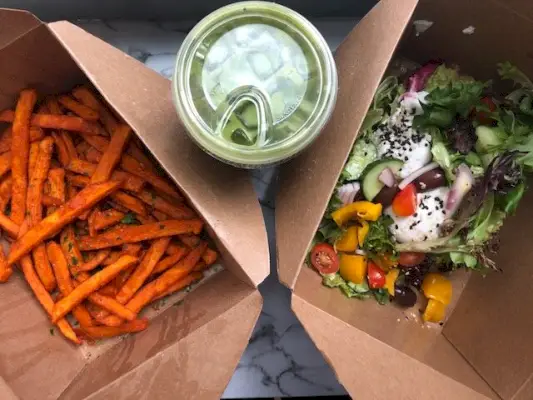 Zu meinem Matcha-Latte bestellte ich Avocado-Toast mit pochiertem Ei und Süßkartoffel-Pommes. Die Pommes waren nicht mein Favorit – ich hätte mir gewünscht, dass sie viel knuspriger wären. Der Avocado-Toast hingegen war absolut lecker. Es bestand aus Sauerteigtoast, Avocado, Kirschtomaten, roten Chiliflocken, Sonnenblumenkernen, Radieschen, Rübenhummus, Zitronenöl und gemischtem Gemüse, außerdem habe ich ein pochiertes Ei hinzugefügt. Ich glaube, das Gemüse sollte ein Beilagensalat sein, aber als ich alles zurück in meine Wohnung trug, fiel es irgendwie auf den Toast und ich aß es einfach so, was immer noch köstlich war.