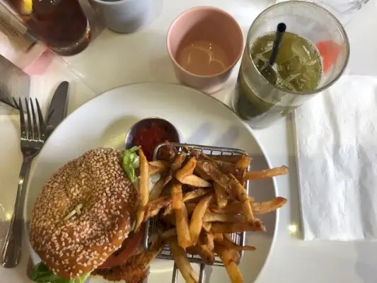 Diese Matcha-Limonade von Sunflower war vielleicht das Getränk, auf das ich mich am meisten gefreut habe, also habe ich mir das Beste natürlich für den Schluss aufgehoben. Es wurde mit rosa Limonade zubereitet, was es so hübsch aussehen ließ. Zuerst habe ich nur Limonade probiert, aber nachdem ich sie gemischt hatte, vermischten sich die Aromen gut und ergaben ein leckeres und erfrischendes Getränk. Mein knuspriges Hühnchensandwich wurde auf einem Brioche-Brötchen serviert und mit Salat, Tomaten, Zwiebeln, Gurken und Spezialsauce belegt. Ich habe dieses Sandwich wirklich genossen, obwohl die Gurken etwas hell waren und der Belag aufgrund der Soße abrutschte. Zum Sandwich gab es normale Pommes Frites, die genau so schön knusprig waren, wie ich es mag.