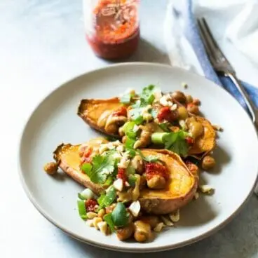 Dieses einfach gebackene Süßkartoffelrezept nach thailändischer Art ist vegetarisch, glutenfrei, vegan, pflanzlich und milchfrei.