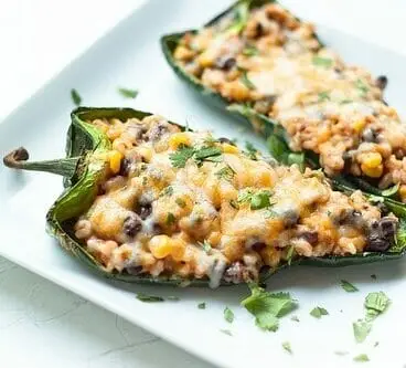 Dieses vegetarische Rezept für gefüllte Poblano-Paprikaschoten ist das Ergebnis umfangreicher Recherchen. Die Grundidee ist einfach und bietet viel Flexibilität. Während Sie etwas Reis kochen, braten Sie die Poblano-Paprikaschoten, damit sie leicht geschwärzt und zart werden (gemäß der oben beschriebenen Methode). Mischen Sie dann den Reis mit einigen schwarzen Bohnen, Mais, Frühlingszwiebeln und Salsa für die Füllung. Mit Käse belegen und erneut nur 2 Minuten grillen!