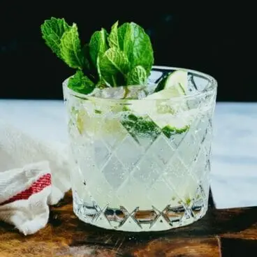 *Orgeatsirup ist ein alkoholfreier Mandelsirup, der zum Süßen von Cocktails verwendet wird. Es hat einen unverwechselbaren nussigen Geschmack mit einem Hauch von Zitrusfrüchten, der schwer zu reproduzieren ist. Orgeat finden Sie ganz einfach in Ihrem örtlichen Spirituosengeschäft oder online. Oder, um den Minzgeschmack hier wirklich zu verstärken, verwenden Sie Einfacher Minzsirup .