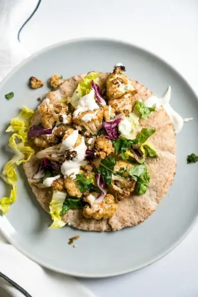 Dieses einfache Pita-Sandwich enthält eines unserer Lieblingsgemüse: gerösteten Blumenkohl! Es ist eingebettet in ein Pita-Gericht mit knusprigem Römersalat und wird mit einer Joghurt-Tahini-Sauce beträufelt, die das gesamte Sandwich abrundet.