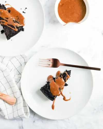 Dieser Brownie-Kuchen besteht aus einer gesalzenen Ahorn-Tahini-Sauce. Ja, das hast du richtig gehört! Durch das Mischen von Tahini, Ahornsirup, Espressopulver und Salz wird die Soße fast karamellartig. Hier wird es über den Brownie-Kuchen geträufelt, passt aber zu fast allem: Vanilleeis, einem Pfannenkeks oder veganen Brownies.
