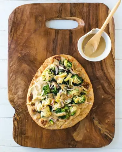 Naan-Pizzen eignen sich gut für den Wochentag, sodass Sie sich nicht um die Zubereitung und Formung des Pizzateigs kümmern müssen. Stattdessen einfach den Belag auf gekauftes Naan-Brot oder Pitas verteilen und backen. Diese Naan-Pizzen werden mit Hummus bestrichen und mit Brokkoli, Mangold und Artischocken belegt. Um das Ganze abzurunden: ein aromatischer Spritzer aus Tahini, Miso und Orangensaft.