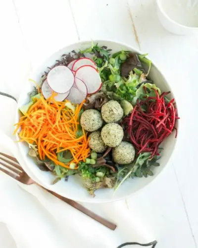 Dieses Tahini-Rezept ist ein bewährter Favorit. Falafel sind beliebte mediterrane Kichererbsenküchlein, die typischerweise in einer Pita serviert werden: Hier werden die Falafel in rohe, vegane Energiebällchen voller mediterraner Gewürze zerlegt. Mit der Zitronen-Tahini-Sauce garnieren und schon haben Sie eine Schüssel voller Nährstoffe und Geschmack.