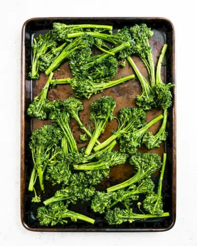 Gerösteter Broccolini passt gut zur Raffinesse von Jakobsmuscheln, falls Sie ihn finden können! Diese einzigartige Brokkolisorte hat lange, elegante Stiele, einen süßen Geschmack und eine zarte Knusprigkeit. Er röstet noch schneller als Brokkoli und ist daher eine schnelle und einfache Beilage.
