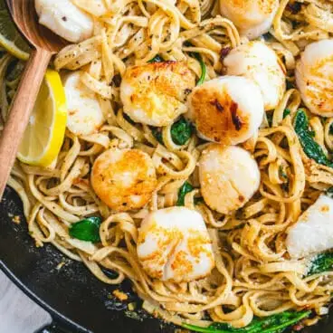 Diese Jakobsmuschelnudeln ergeben ein atemberaubendes Abendessen! Beeindrucken Sie alle am Tisch mit diesem eleganten Rezept, gewürzt mit Zitrone, Knoblauch und Kräutern. Ergänzen Sie es mit einigen der Beilagen in der Liste oben!