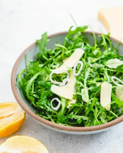 Eine weitere fantastische Beilage zu Jakobsmuscheln: der einfachste Rucola-Salat. Es ist wahrscheinlich der einfachste Salat, den Sie zubereiten können. Sie müssen nicht einmal ein Salatdressing zubereiten! In 5 Minuten haben Sie einen eleganten Salat, der buchstäblich zu allem passt.