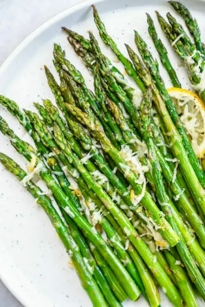 Hier ist ein perfektes Paar mit Jakobsmuscheln, die einen tollen Farb- und Formkontrast bilden: einfach gebacken Spargel! Es wird im heißen Ofen gebacken, bis es weich, aber immer noch schön grün ist. Dann wird es mit Zitrone bespritzt: So wird es zubereitet gesundes Gemüse schmecken überwältigend gut. Der letzte Schliff: geschmolzene Parmesanspäne.