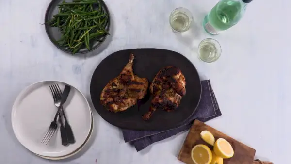 Reduzieren Sie die Grillhitze auf mäßig niedrig. Drehen Sie das Hähnchen um und grillen Sie es bei direkter Hitze unter gelegentlichem Wenden, bis es leicht verkohlt ist und ein sofort ablesbares Thermometer in den Innenseiten der Schenkel 160 °F anzeigt, weitere etwa 15 Minuten.